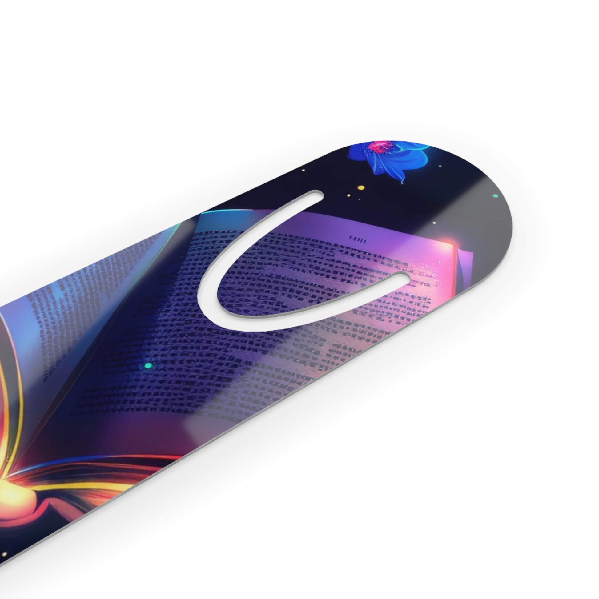 A slim, artful aluminum bookmark that slips into pages like a promise kept. Lightweight and smooth to the touch, it carries one-sided, vivid artwork — a swirl of luminous colors and floral accents — that peeks out from between chapters. The rounded top and U-shaped slot gently cradle a page without tearing, while the brushed aluminum back gives it quiet durability. For readers who savor the pause between paragraphs, this bookmark turns a moment of rest into something quietly beautiful.