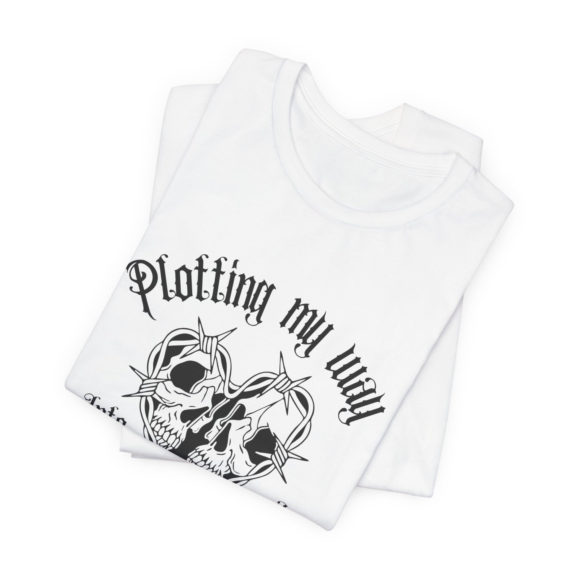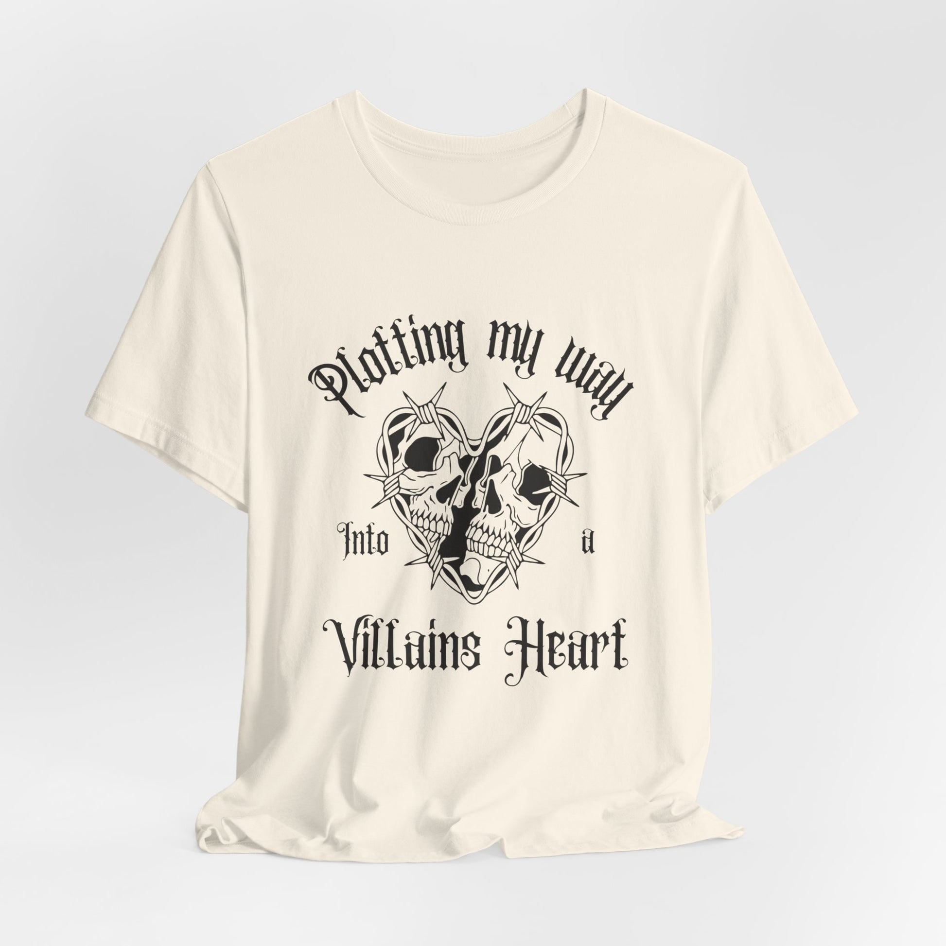 This lightweight, breathable tee brings dark romance to everyday wear. A vintage-style skull-and-rose crest sits at the chest, framed by ornate lettering that reads ‘Plotting my way into a Villain’s Heart’ — moody, playful, and a little mischievous. The neutral white base lets the detailed black line art stand out, so the design reads clearly whether layered under a jacket or worn on its own. It’s cut with a classic crew neckline and a retail fit that drapes comfortably without feeling boxy. Wear it to signal your love for gothic aesthetics, late-night playlists, and stories with antiheroes — a quiet, confident statement that blends into coffee shops, concerts, and laid-back evenings out.